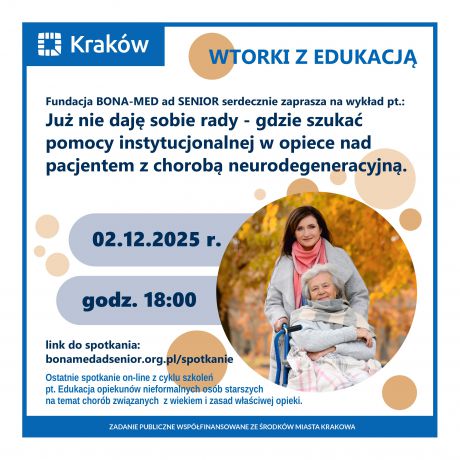 Serdecznie zapraszamy wszystkie osoby opiekujące się osobami starszymi na wykład on-line: Gdy dom to za mało - gdzie szukać pomocy instytucjonalnej w opiece nad pacjentem z demencją, chorobą otępienną, chorobą Alzheimera.